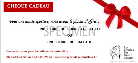 Vous recherchez une idée originale pour faire un cadeau à un proche? Les Écuries du Grand Chemin vous proposent un bon cadeau d'une heure de cours collectif ou une heure de ballade. Pour bénéficier de cette offre merci de nous contacter.